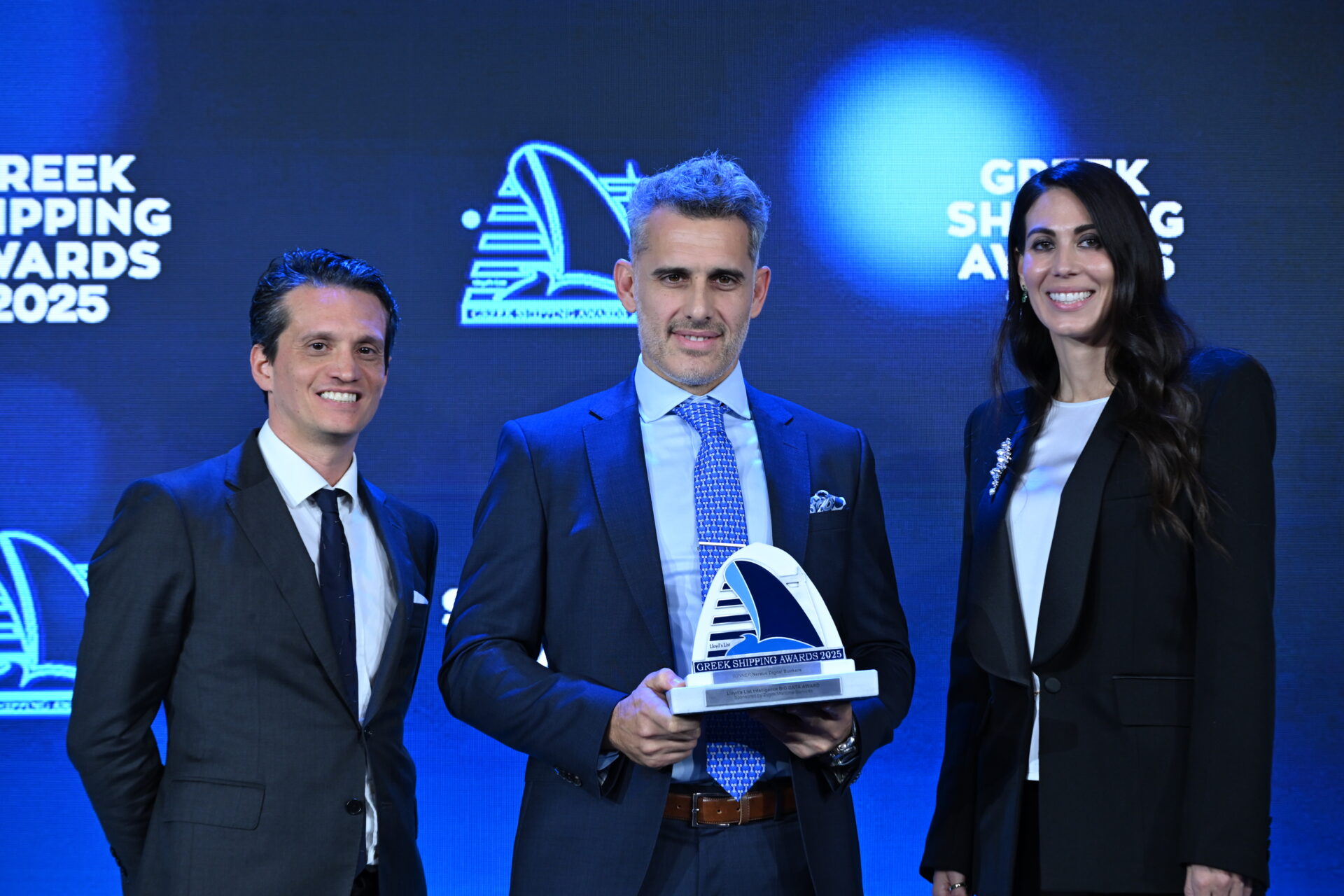 Lloyd’s List Intelligence Big Data Award – Pantelis Sapsis (centre) of sponsor Zygos Maritime Services presenting the Award to Nikolaos Gkikas and Kelly Dritsa of Nereus Digital Bunkers