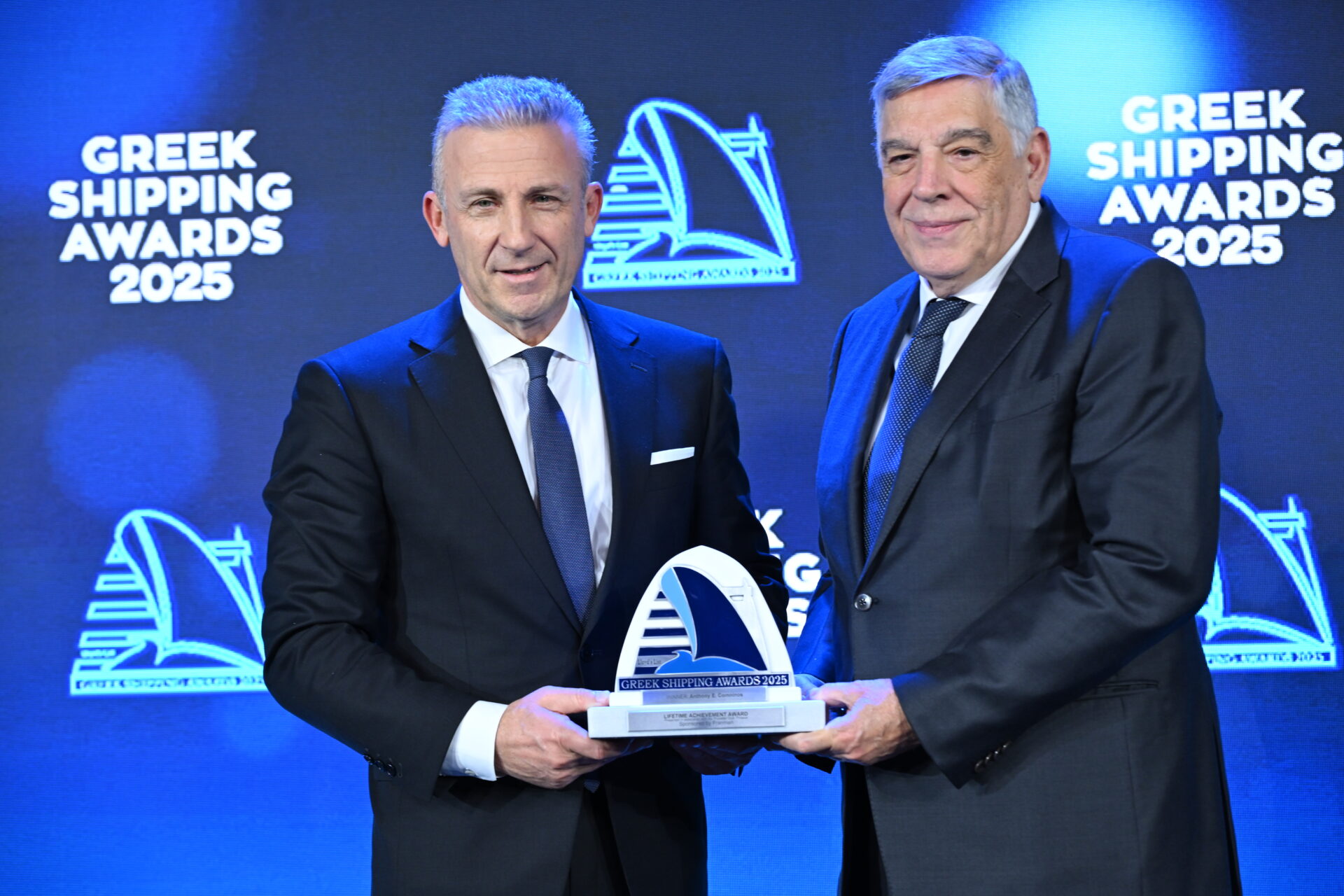 Lloyd’s List/Propeller Club Lifetime Achievement Award – Costis Frangoulis (left) of sponsor Franman, presenting the trophy to Anthony E. Comninos