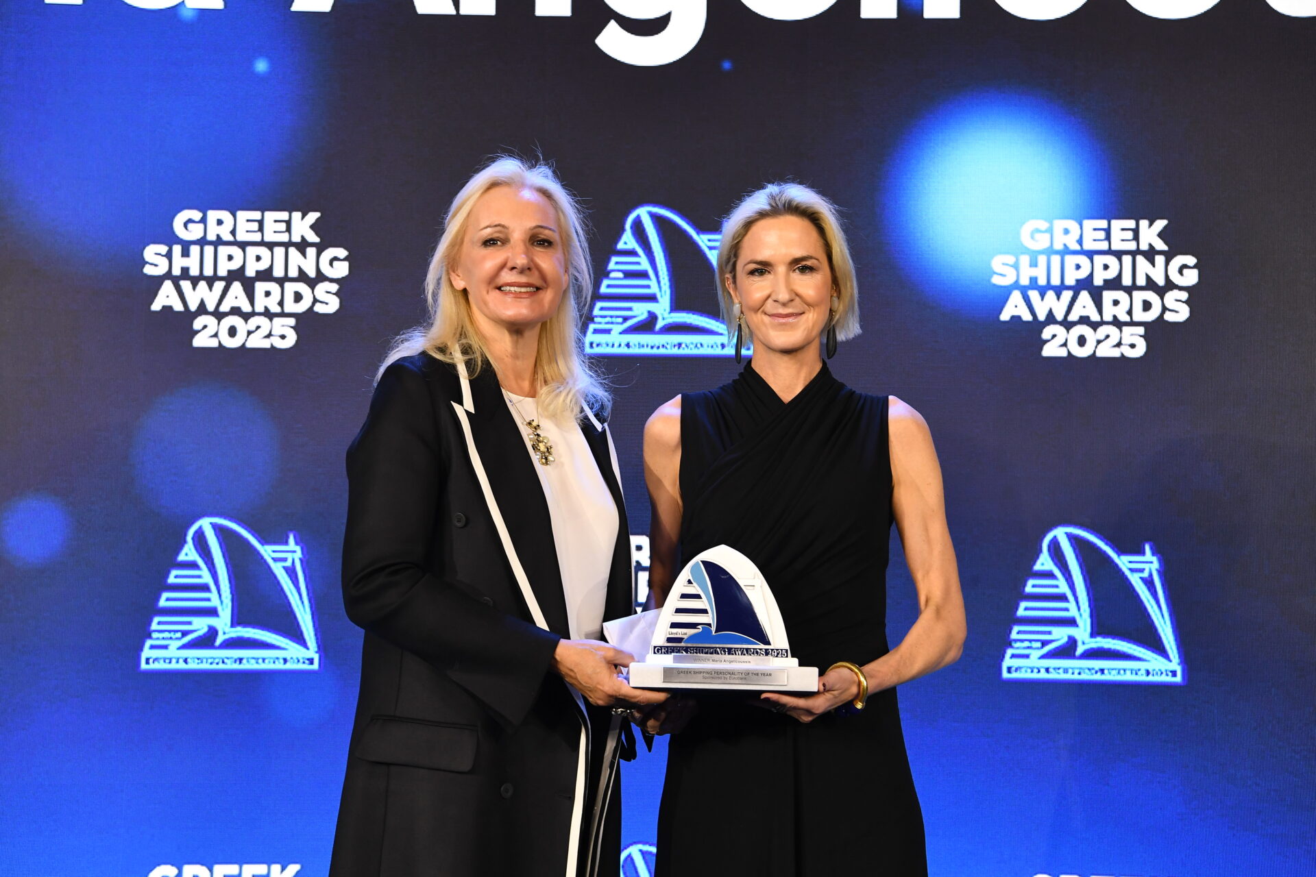 Greek Shipping Personality of the Year – Christina Margelou (left) of sponsor Eurobank, presenting the Award to Maria Angelicoussis